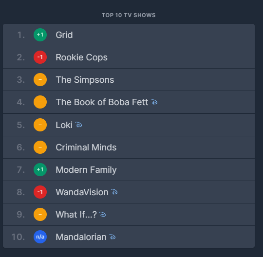 1위 – 그리드 2위 – 너와 나의 경찰 수업 3위 – 심슨 가족 4위 – 북 오브 보바펫 5위 – 록키 6위 – 크리미널 마인드 7위 – 모던 패밀리 8위 – 원더비전 9위 – 와트 이프 10위 – 크리미널 마인드 7위 – 모던 패밀리 8위 – 원더비전 9위 – 워드 이프 10위 – 워드 로지맨