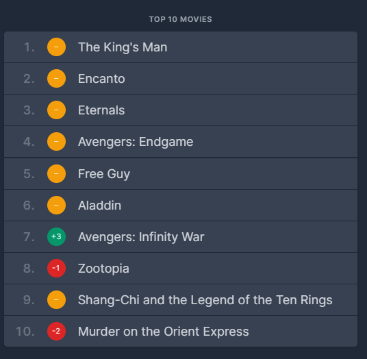 1위 – 킹스맨 : 퍼스트 에이전트 2위 – 엘칸토 3위 – 이터널스 4위 – 어벤져스 : 앤게임 5위 – 프리 가이 6위 – 알라딘 7위 – 어벤져스 : 인피니티 워 8위 – 주토피아 9위 – 프리 가이 6위 – 알라딘 7위 – 알라딘 7위 – 어벤져스 : 인피니티 워 8위 – 주토피아 9위 – 생초