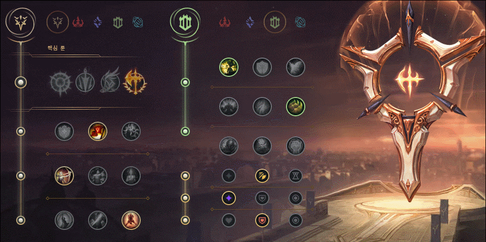 버전의 경우 결의(철거, 뼈의 방패)가 가장 무난한 선택사항이고 감당하기 힘든 챔피언을 만났을 때는 지배(돌발일격, 굶주린 사냥꾼)를 쓰는 것도 좋습니다. 당연히 방어력은 상대에 따라 마법저항력으로 변경되어야 합니다.