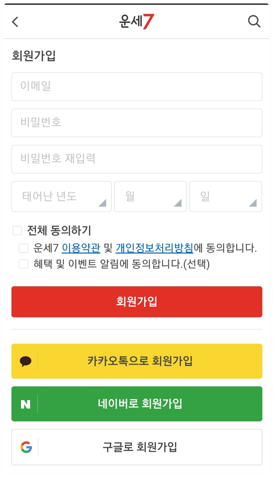 일단 운세 7은 회원가입을 하고 나서 쓰면 되는데 가입하는 방법도 굉장히 간단해요이메일로 앱에 직접 가입하셔도 되고, 카카오톡이나 네이버 구글에서도 회원가입이 간편하기 때문에 매우 편리합니다. 저는 카톡으로 간단하게 가입해서 진행했어요!