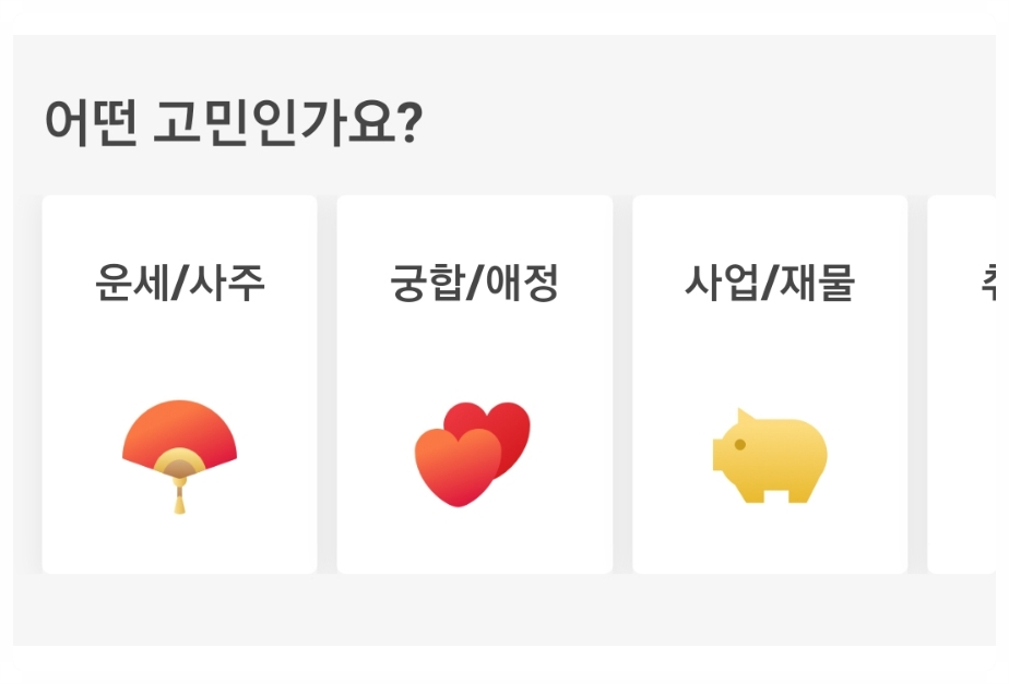 또 다른 카테고리에서도 선택할 수 있지만 바로 제 고민 중 선택가능 해운/사주, 궁합/애정, 사업/재물, 취업/시험풍수, 이사/택일, 결혼/직업, 진로/꿈의 해몽