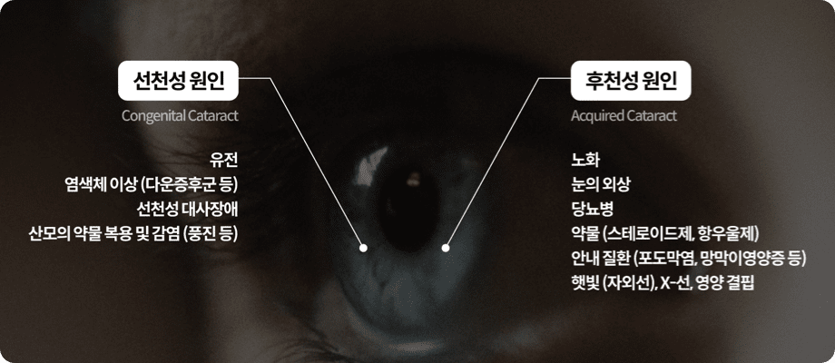 백내장은 우리 눈에서 카메라 렌즈 역할을 하는 수정체가 혼탁해져 빛이 제대로 통과하지 못해 시력 장애가 발생하는 안질환입니다. 갑작스러운 시력 저하로 사물이 흐릿하게 보이거나 눈부심, 눈이 침침하고 이물감을 느끼면 백내장이 의심됩니다. 장기간 자외선 노출, 당뇨병으로 인한 합병증, 흡연 및 음주 등 다양한 원인으로 백내장이 발생하지만 가장 주된 발생원인은 노화이지만 보통 60세 이상의 노년층에서 자연스럽게 백내장이 나타납니다. 그러나 최근에는 젊은 백내장 환자가 늘고 있습니다. 백내장은 그대로 방치하면 실명에 이를 정도로 위험하므로 반드시 치료를 받아야 합니다.