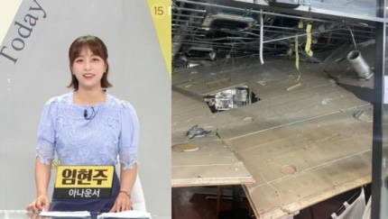 임 아나운서는 이날 인스타그램을 통해 “아침 방송을 마친 지하 식당에서 김밥 한 줄을 시켜 먹으니 갑자기 천장이 무너져 내렸다”며 합판으로 된 천장이 무너진 현장 사진을 공개했다.
