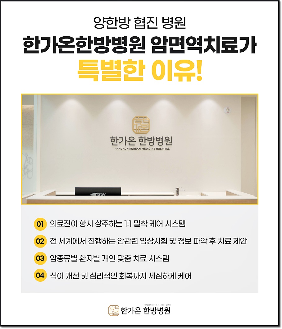 따라서 심리적인 부분을 안정화시키는 것은 표준치료에 견딜 수 있는 원동력이며 치료의 효과도 거둘 수 있는 만큼 다양한 전인치료를 통해 심리적 관리를 하는 것도 면역치료의 한 부분이라고 할 수 있습니다.