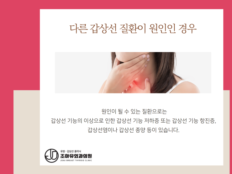 원인이 될 수 있는 질환으로 갑상선 기능의 이상에 의한 갑상선 기능 저하증 또는 갑상선 기능 항진증, 갑상선염이나 갑상선 종양 등이 있습니다.