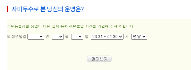 생년월일, 시간, 평달, 윤달 등 구분에 맞게 입력하고 결과보기 버튼을 누르면 결과가 나옵니다.