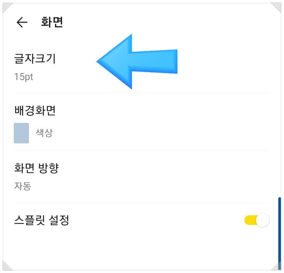제일 먼저 나오는 게 글자 크기예요밀고 들어가면 오른쪽 화면처럼 나오고, 그 글씨의 크기가 딱 중간입니다.