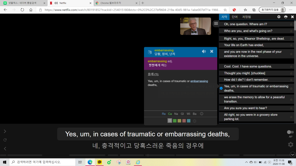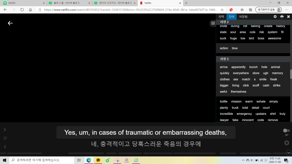 이렇게 자주 나와요.크롬이나 엣지로 사용하면 이 아래 사진의 상단 부분을 보면 빨간 부분이 보이시죠? 네, 저게 나와 있으면 넷플릭스로 영어 자막을 사용할 수 있어요!