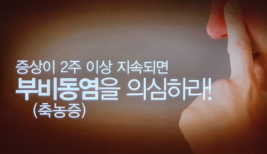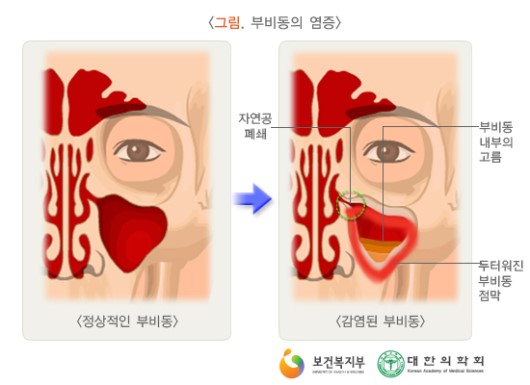 ♥ 부비강염 증상 : 코막힘이나 콧물이 주된 증상으로 일반 비염과 달리 콧물이 노랗고 발열이나 두통을 동반하는 경우가 많으며 염증이 있는 부위를 손으로 누르면 통증을 느낄 수도 있습니다.부비강의 역할 중 두개골을 가볍게 하고 눈과 뇌를 보호하는 기능을 상실하며, 증상이 심해지면 주변에 있으며, 눈과 뇌로 퍼져 시력장애, 안구통, 심한 두통과 구토가 발생할 수 있습니다.