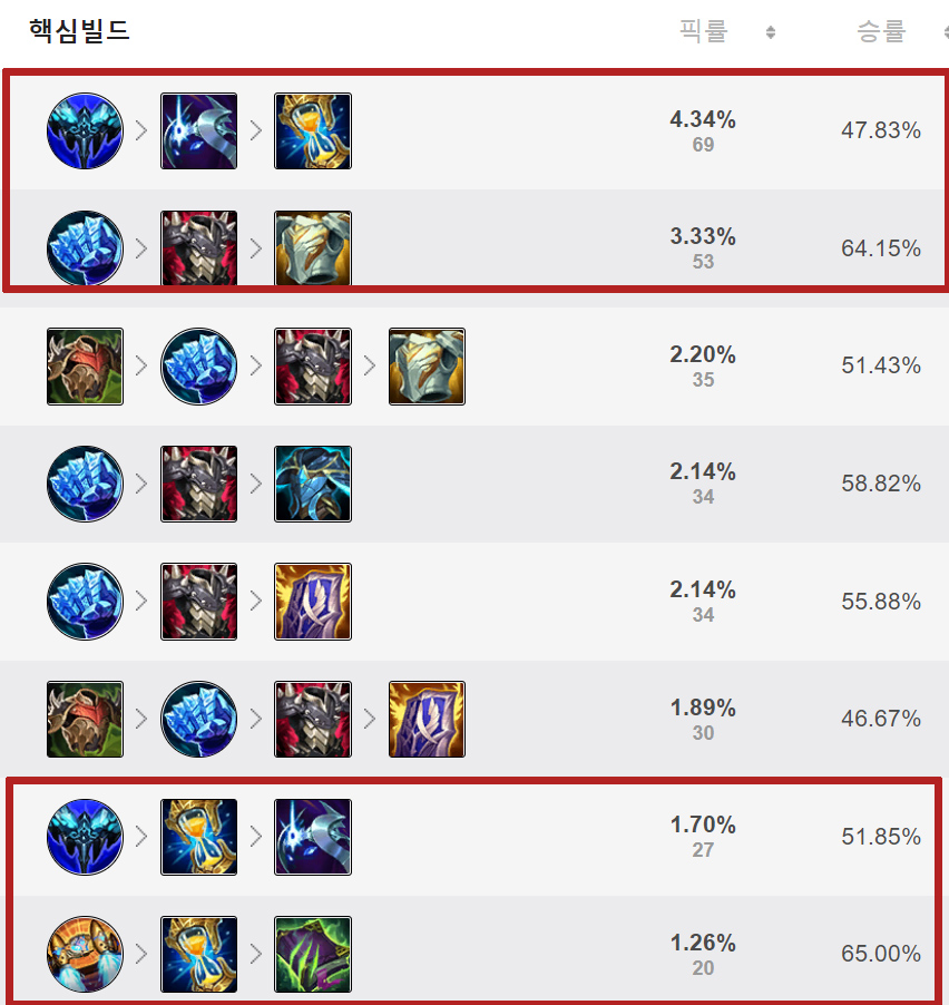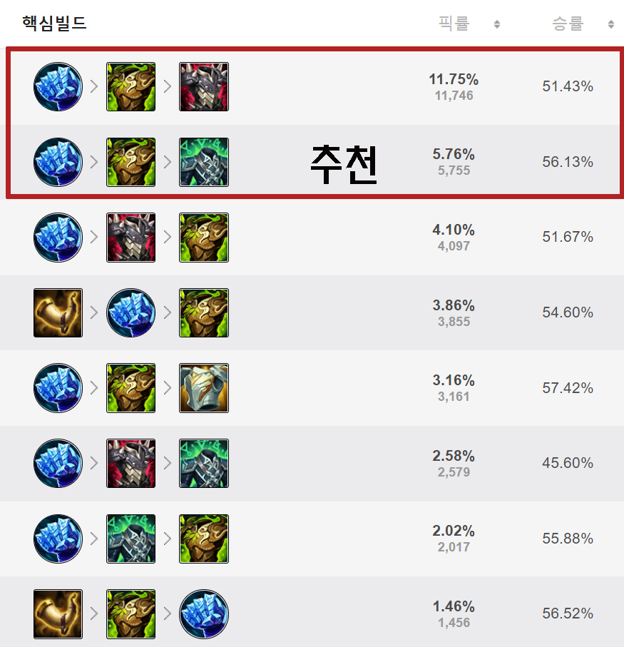 1코어 아이템은 서리화불판 가면 됩니다. 왜냐하면 평탄할 때 e스킬의 가시가 나오는데 효과가 가장 좋기 때문에 좋습니다.가시 갑옷 2개나 워모그로 가시면 됩니다.3코어 정령의 형상 (만약 마법 데미지를 챔피언이 많으면 2코어로 만들 수도 있습니다) 4코어 돌갑옷 여기까지 온다면 엄청난 탱커 역할을 하고 있을 것 같습니다.그러면 딜이 안 나오는 거 아니야? 이럴 수도 있는데 생각보다 딜이 잘 나와요.5 코어의 상황에 맞추어 가십시오. 수호천사도 잘 어울리는 것 같아요.