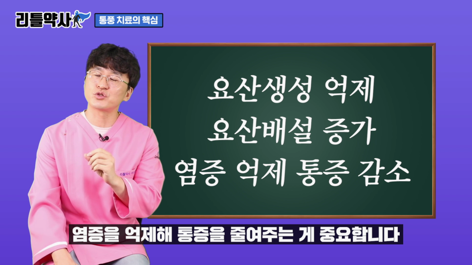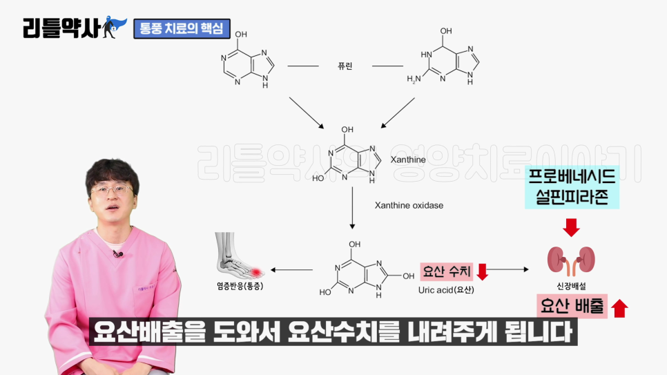 요산 생성 억제, 요산 배설 증가, 항염 작용의 논리라고 할 수 있습니다.