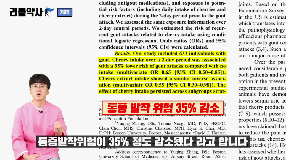 체리를 먹은 사람이 그렇지 않은 사람에 비해 통증 발작이 35% 정도 감소하고,