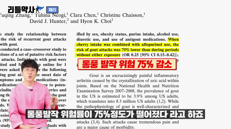 통풍 치료제인 알로프리놀과 체리를 함께 먹었을 때 통풍 발작의 위험률이 75%나 떨어졌다라고 합니다