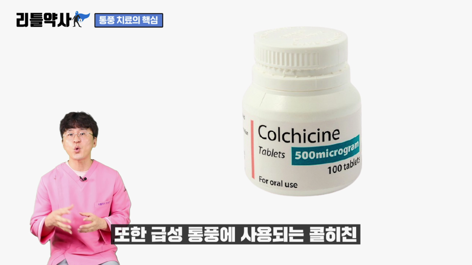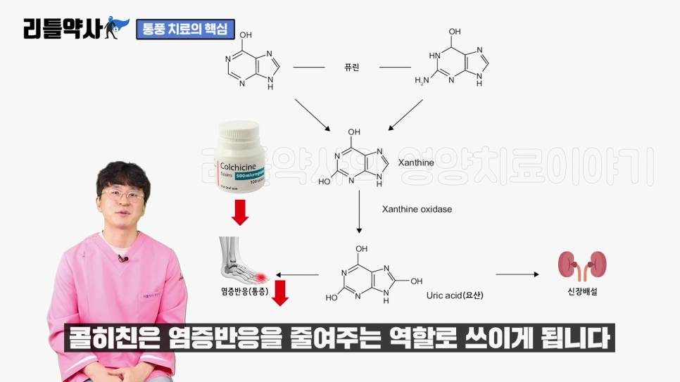또한 급성 통풍에 사용되는 콜히틴!!콜히틴은 염증 반응을 줄이는 통증을 억제하는 역할로 사용됩니다.