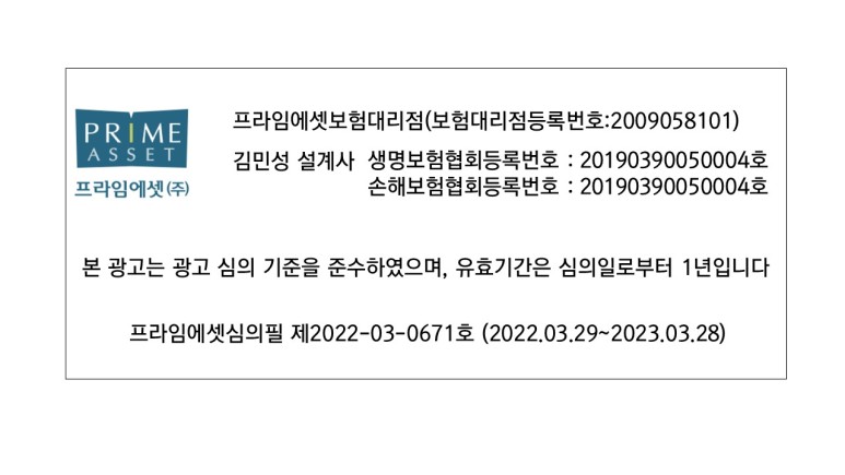 ※ 위의 내용은 모집 종사자 개인의 의견이며, 계약 체결에 따른 이익 또는 손실은 계약자 및 피보험자에게 귀속됩니다.