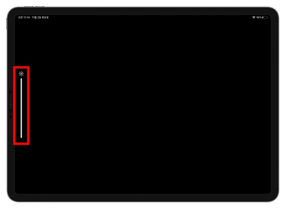 제어센터의 화면 밝기 조절 버튼에서도 가능합니다. 아이패드의 오른쪽 상단을 아래로 떨어 뜨리면 제어센터가 나오는데, 여기에서 화면 밝기를 위아래로 자유롭게 조절을 해 주세요.
