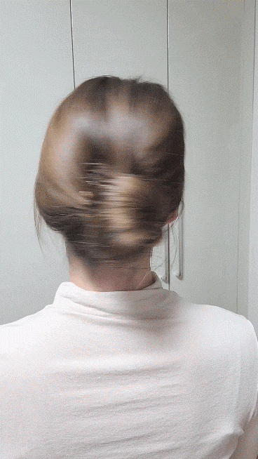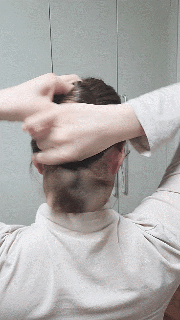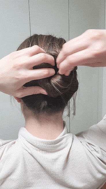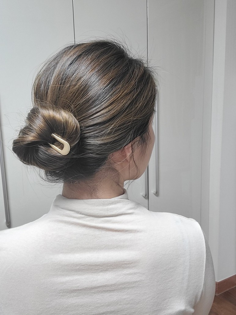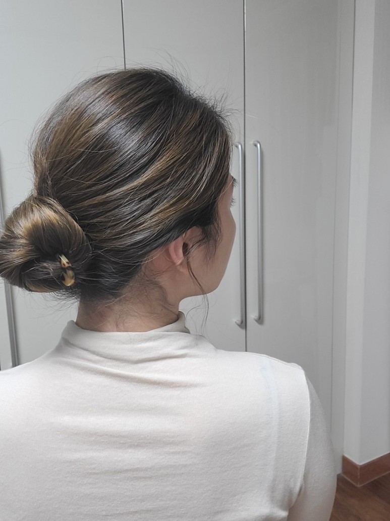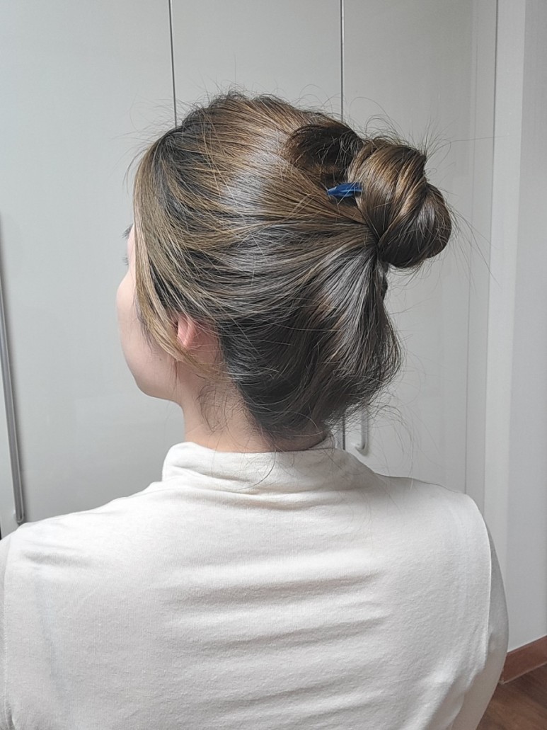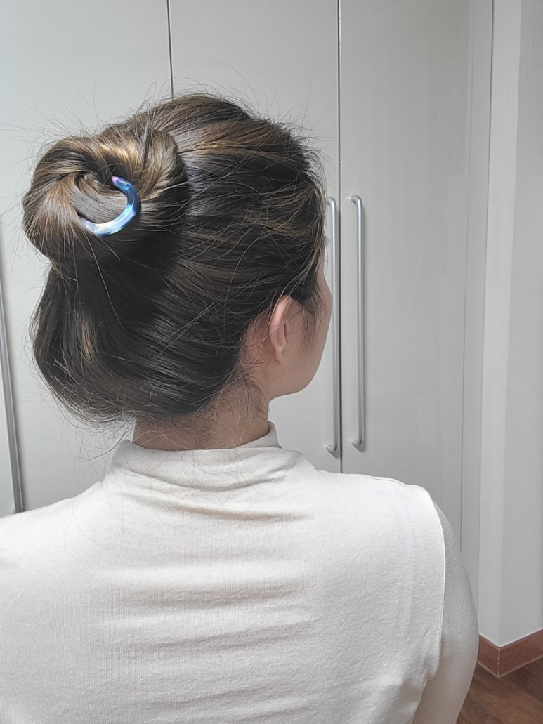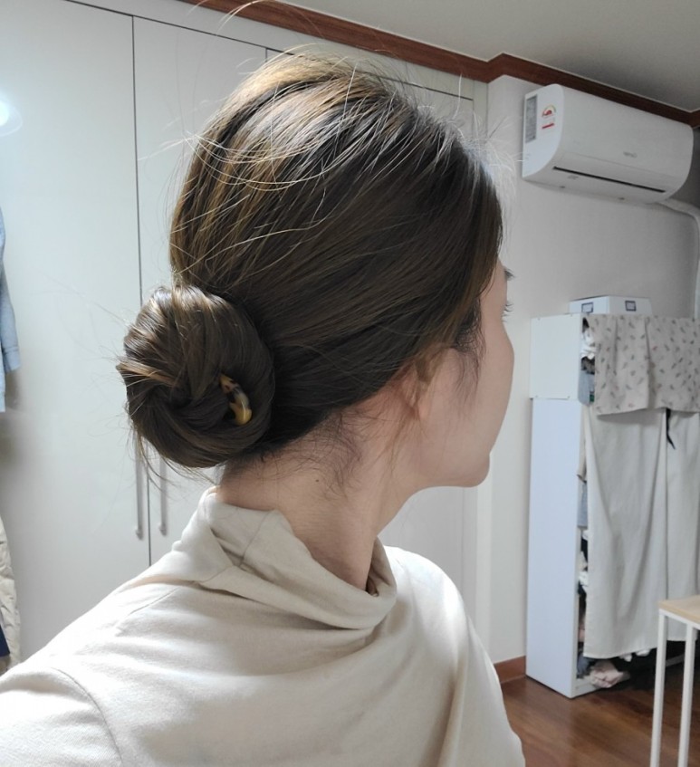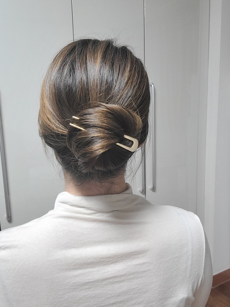 똥머리처럼 돌돌 말아주세요.가운데 구멍에 비녀를 넣습니다.수직으로 꽂아 코바늘뜨기처럼 두피에 가까운 머리카락을 건져서 반대쪽으로 내주세요.집게핀처럼 머리카락이 당겨지지 않고 생각보다 고정되어 잘 빠지지 않게 되었습니다.고정력은 집게핀보다 낫다