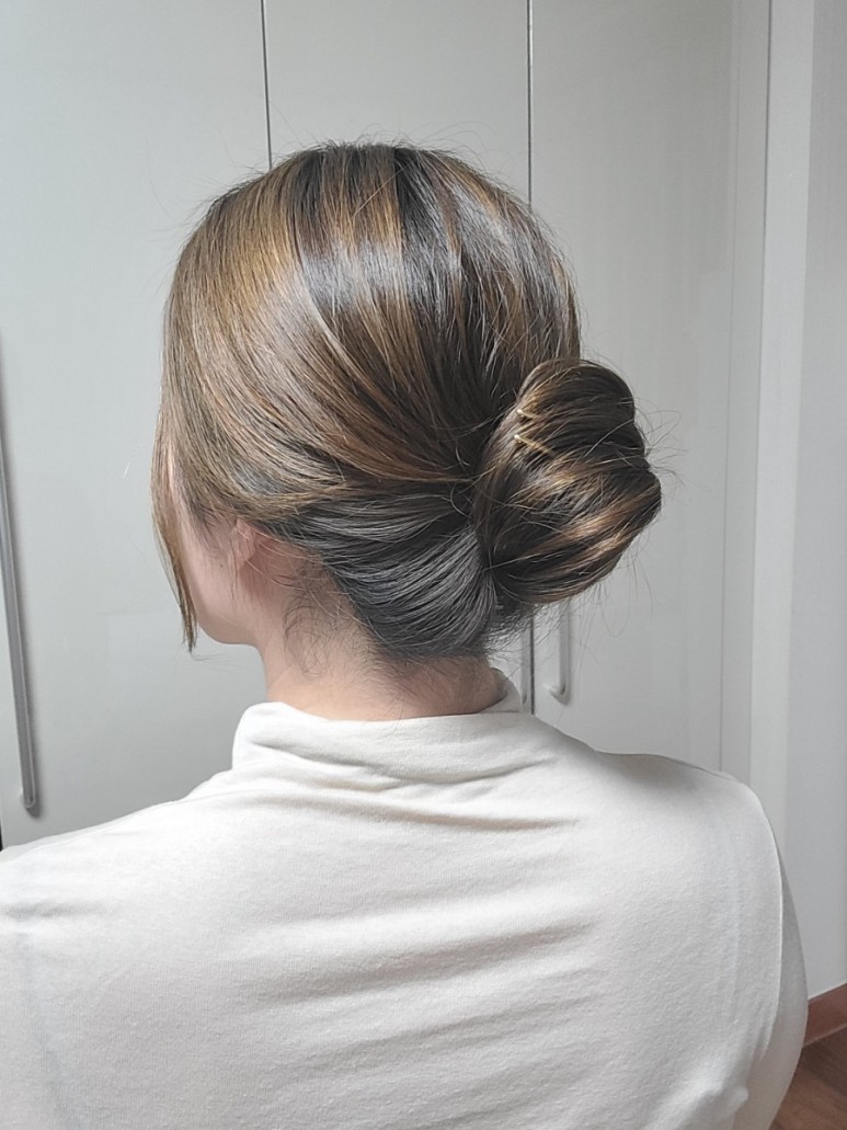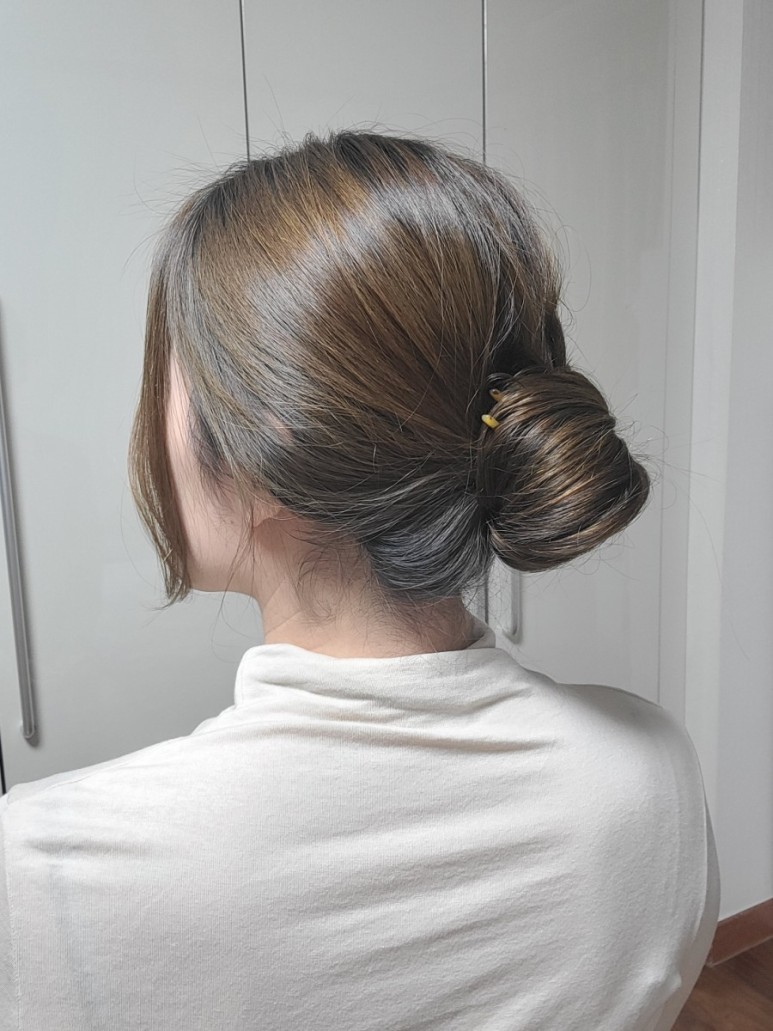 비녀는 처음 써보는건데 처음엔 고정이 안되고 풀려서 잘못샀나 했는데.. 보니까 너무 쉬워요.. 그래도 맘에 들려면 3~4번 해야되요 *** 꽉묶으면 한복 비녀룩~~ 옆머리를 조금씩 떼어내세요 (웃음)