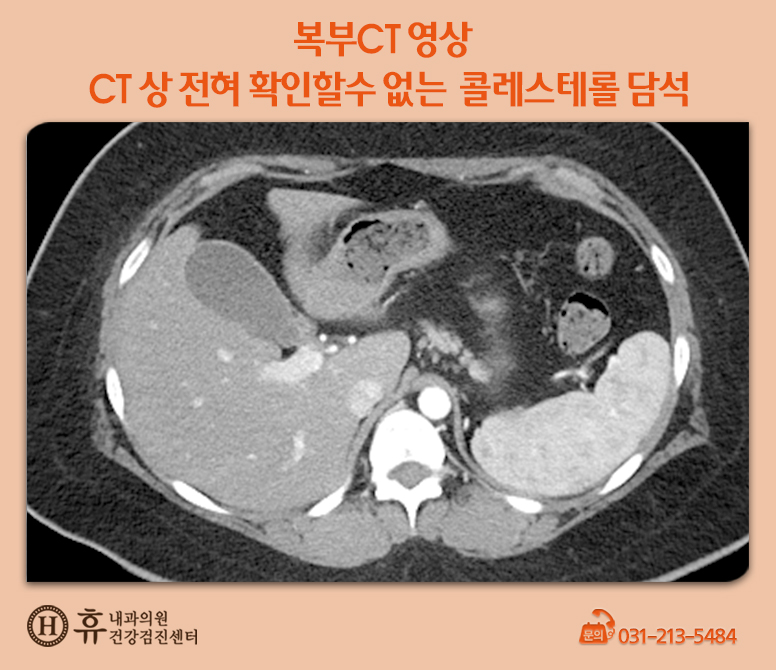 콜레스테롤 담석처럼 칼슘 성분이 적은 경우는 CT 방사선 사진에서는 볼 수 없는 경우가 많습니다.