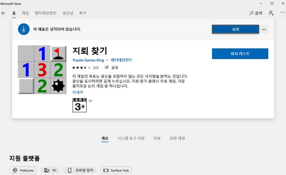 검색을 하고 지뢰찾기를 누르면 이런 화면이 나옵니다. 여기서 다운받으시고 설치하기 눌러주세요.너무 쉽죠?