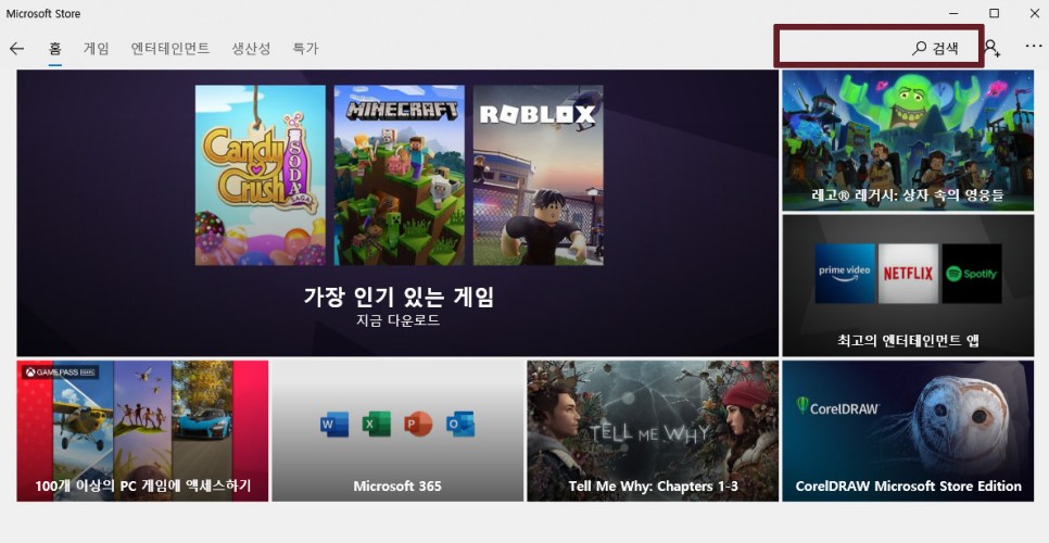 스토어에 접속하시면 이 다양한 화면이 나타납니다. 여기서 위에 짤을 보시면 사각검색이라는 게 있어요.거기서 지뢰찾기라고 한글로 입력하면 돼요.전에는 영어로 입력해야 했는데 지금은 아니에요. 한글로 입력해도 동일하게 표시됩니다.