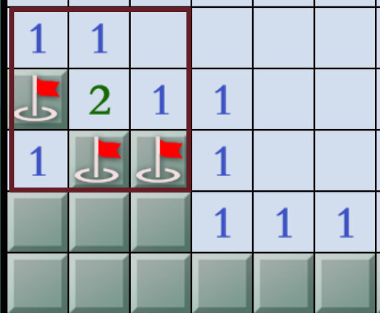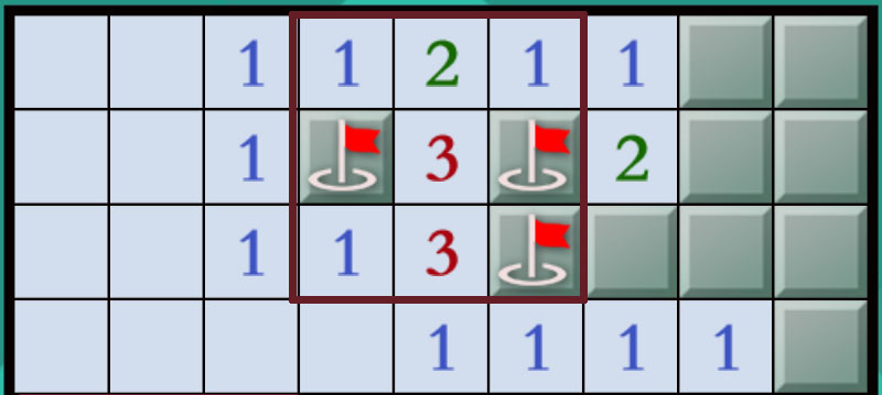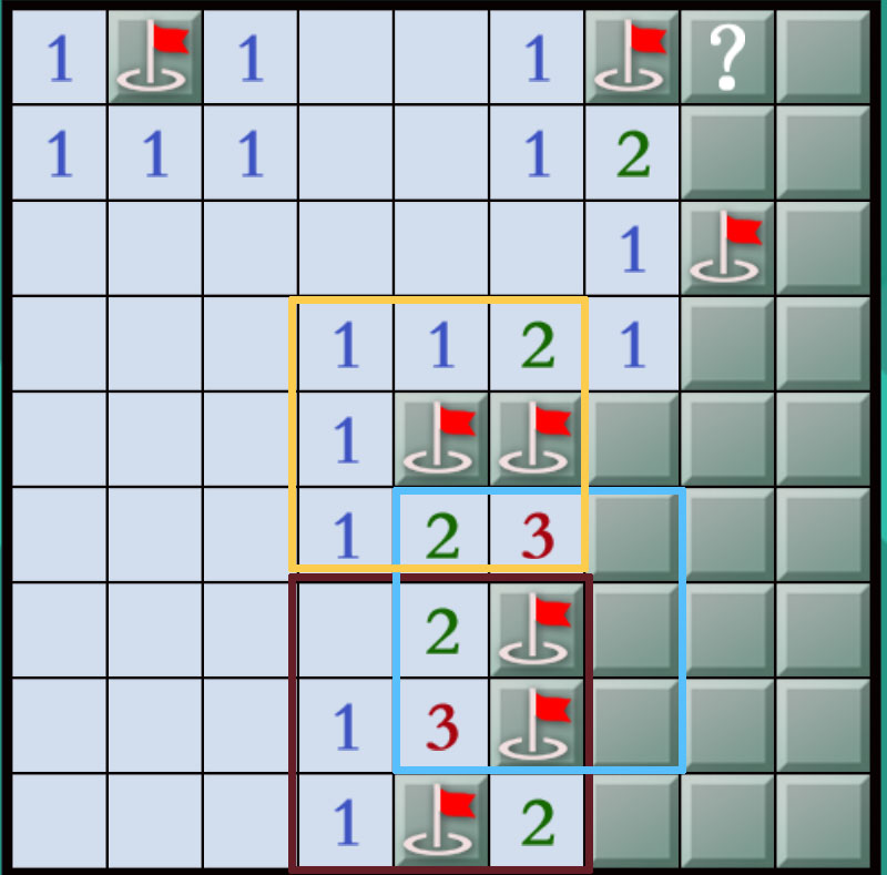 자, 이걸로 확인해보겠습니다 빨간네모칸을보세요.주변에 지뢰가 하나 겹치잖아요? 그런데 1 옆에 보면 3이 있고, 3등에 2가 있죠?그러면 빨간색으로 네모나게 마무리한 곳에 지뢰는 총 3개가 있는 거예요 그래서 저렇게 지뢰를 표시했어요.그리고 파란색의 네모난 곳을 보세요.두 숫자 주변에 지뢰가 2개 있죠. 왼쪽위숫자2는위에지뢰가두개가있어서끝났고,다른숫자2는아까빨간색에서지뢰를찾았기때문에끝났어요.그러면 노란색을 보세요 노란색 보면 1111 보이죠? 자,그러면1주변에지뢰가하나있다는뜻이겠죠?그리고 숫자가 2가 있기 때문에 1 주변에 하나가 아니라 또 하나 있다는 거죠. 이렇게사각형칸을머리에넣으면서지뢰를찾으면금방익숙해질수있을겁니다.여기 화면에서는 ?는 어떤 기능이 있는 것이 아니라 ‘정확한 위치를 모른다.’ 라는 애매한 의미의 표시입니다.이렇게표시를하면서모르면요?라고표시를해주고넘어가면서쉽게할수있어요. 지뢰찾기는사방에비교를하면서지뢰를찾는두뇌게임인가봐요.●이해를 돕기 위한 지뢰 찾기