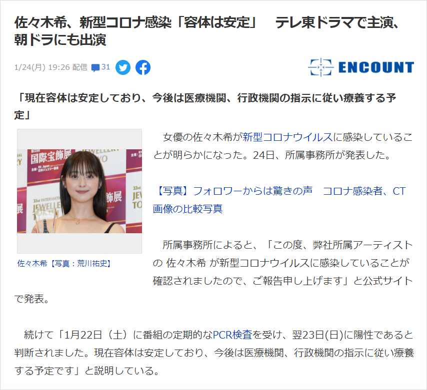 소속 사무소에 의하면, “이번, 폐사 소속 아티스트 사사키 노조미가 신종 코로나 바이러스에 감염된 것이 확인되었으므로, 보고 말씀드립니다.”라고 공식 사이트에서 발표.