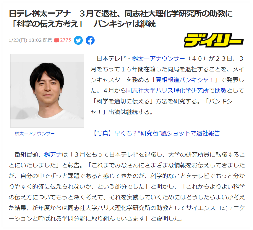 니혼TV 마스다 이치 아나운서(40)가 23일, 3월자로 16년간 재직한 방송국을 퇴사하는 것을 메인 캐스터를 맡는 「진상 보도 반키샤!」로 발표했습니다.4월부터 도시샤대학 해리스 이화학 연구소에서 조교로서 「과학을 적절히 전하는」방법을 연구합니다.’진상보도 방키샤!’ 출연 계속하겠습니다.