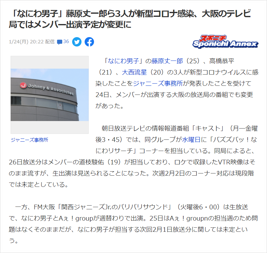 일본 아이돌 그룹 나니와 단시노 후지와라 죠이치로(25), 타카하시 쿄헤이(21), 오오니시 류세이(20)의 3명이 신형 코로나 바이러스에 감염되었다고 합니다.소속 사무소의 쟈니즈가 24일, 그것을 발표, 멤버가 출연하는 오사카 방송국의 프로그램에도 변경이 있었습니다.