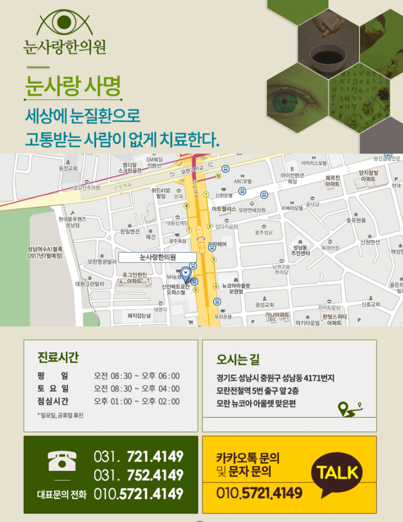 본 대표원장은 지난 30년간 눈 질환을 한의학으로 꾸준히 치료하고 있으며, 마오쩌둥, 김일성의 백내장 치료를 담당한 베이징중의학원 안과병원과의 교류를 통하여 눈 질환 치료에 대한 연구와 개발을 지속하고 있습니다. 28,000명이 넘는 임상경험을 통해 얻은 노하우를 통해 개개인에 맞는 1:1 관리로 눈 건강에 힘쓰고 있습니다. 따라서 정성스럽게 돌보고 도울 수 있습니다.