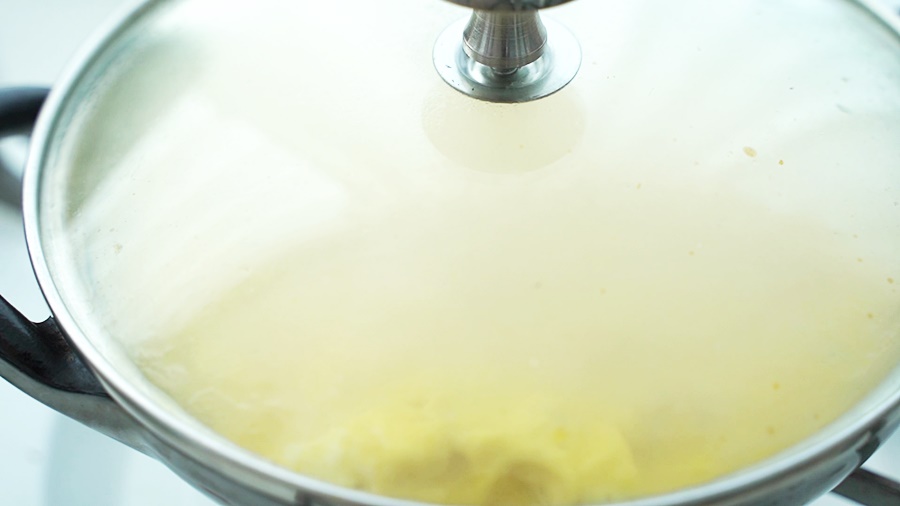 뚜껑 사이로 계란이 익었다 싶으면 불을 끄고 뚜껑을 열면 이렇게 계란찜이 부풀어오릅니다