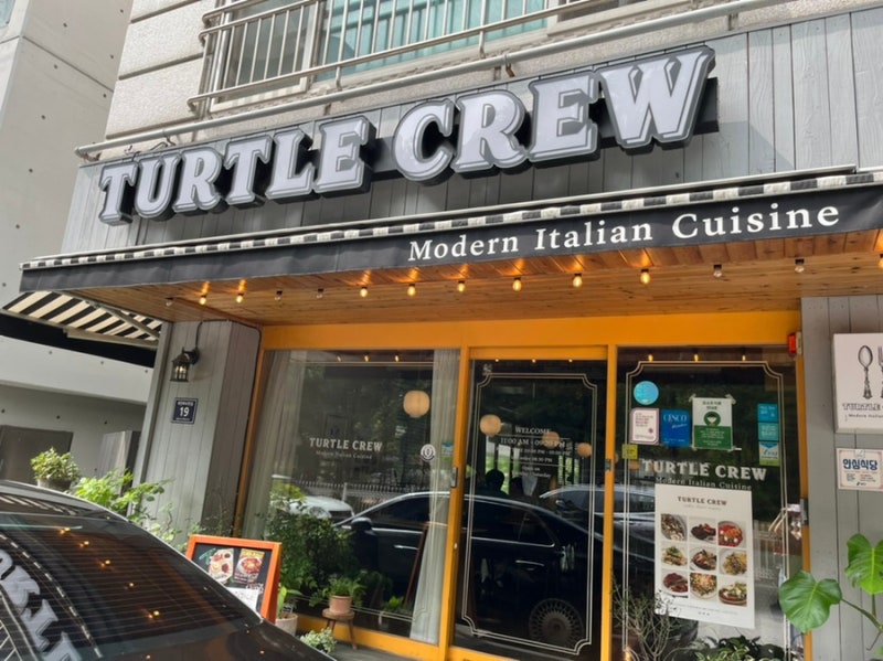 식전빵이 기대 이상으로 맛있었는데 쫄깃한 게 너무 맛있어서 리필하고 싶을 정도였어! 식전빵이 이렇게 맛있으니 식사가 더욱 기대된다.보통은 배부를까봐 식전빵은 다 안먹는데 너무 맛있어서 다 먹었어.쉬림프 로제 리조또랑 쉬림프 알리오올리오 우리집 사람들은 새우를 좋아해서 새우가 듬뿍 들어간 메뉴를 골라봤어. 두메뉴에 새우가 듬뿍 들어 있어서 매우 만족스럽다쉬림프 알리오 올리오는 맵지 않고 오일 파스타의 담백함이 매우 마음에 드는 오일 파스타로 가장 베이직한 알리오 올리오를 주문했기 때문에 특별한 맛은 없지만 기본조차도 매우 맛있었다. 조미료 대신 7시간 동안 직접 끓인 치킨 스톡으로 양념한 보정동 미식 터틀 크루, 건강도 마음에 들었지만 맛도 좋았다.쉬림프 로제 리조또 위에 대하, 새싹, 그리고 날치미가 올라가 있었는데 짠 날치미와 함께 떠먹으니 더 맛있었다. 리조또 안에 숨어있는 새우가 꽤 많은 편이라 먹을 때마다 새우를 집어먹을 수 있어서 마음에 든다. 크림맛보다는 토마토 베이스가 강해서 전혀 느끼하지 않은 로제 리조오늘 내가 보정동 카페거리 맛집을 찾은 이유 리코타라자냐! 우리에게 나왔을 때 아직 치즈가 보글보글 끓고 있었다. 많은 사람들이 터틀 크루로 라자냐를 주문하는 이유를 알겠다 보통 라자냐를 주문하면 느끼해서 먹고 남기게 되는데 이건 클리어.라자냐 사이의 리코타 치즈와 라구소스(세밀하게 다진 고기 믹스된 토마토 소스)가 잘 어우러져 균형이 잘 맞았던 보정동 파스타 맛집! 짜지도 않고 맛도 딱 좋았다 내가 먹어본 라자냐 중 가장 맛있었다.오픈형 주방이라 요리하는 모습을 직접 볼 수 있어 위생적으로는 더 안심하고 자세히는 모르지만 르 꼬르동 블루 수료증인가?! 셰프의 보증된 실력, 맛없는 보정동 카페거리 맛집! 주말 브런치 시간부터 상당한 손님들로 붐비는 터틀 크루. 보정동 데이트 코스로 가도 될 것 같아. 맛:좋은가격:보통분위기:★★★★리피터:★★★★건강을 생각하는 보정동 파스타 맛집#보정동카페거리맛집 #보정동맛집 #보정동파스타 #보정동스테이크 #보정동데이트