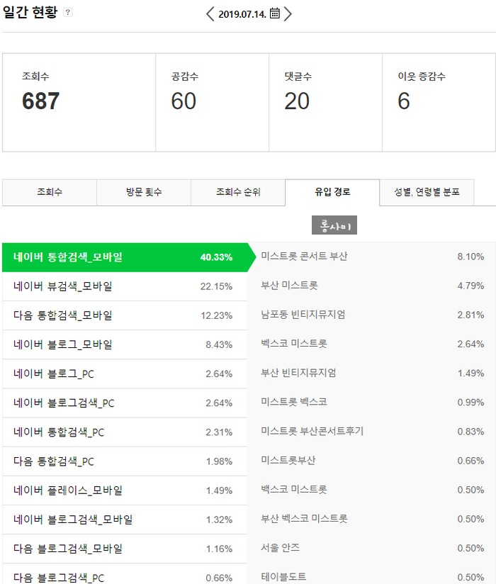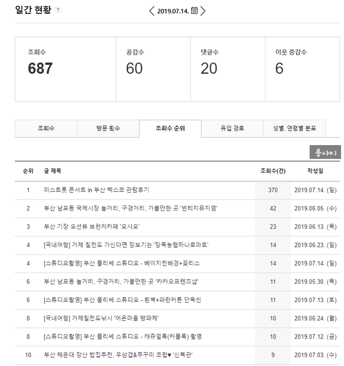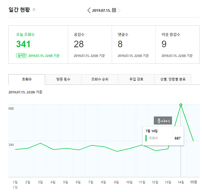 7월 14일 일요일 일간 조회수 역대급!! 687 조회수를 기록하지 않았습니까!소소하게 일상을 담고 있는 초보 블로그인 저에게 항상 200300 조회수만 보고 600개 이상의 조회수는 처음이었습니다!