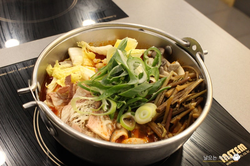 테이블 오른쪽에 온도조절장치가 있는데 전원버튼을 눌러 가장 높은 단계(High)에서 3~4분 정도 끓인다. 부글부글.