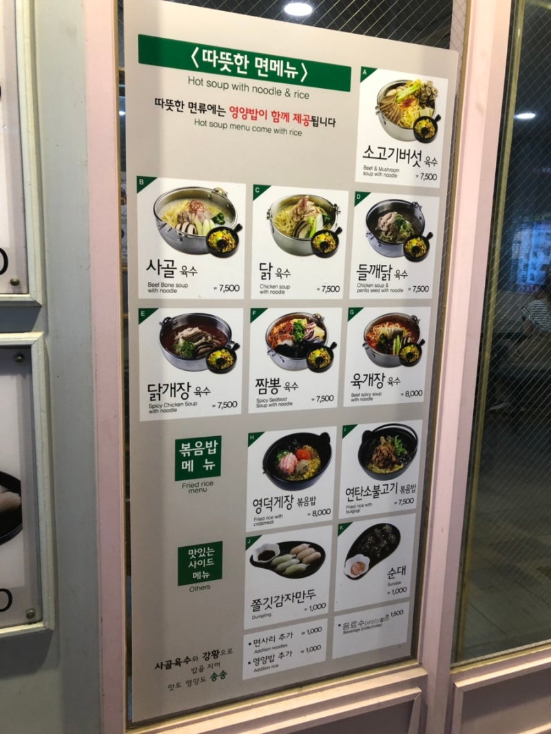 크고 따뜻한 면, 볶음밥, 사이드 메뉴가 있는데 따뜻한 면류를 주문하면 면을 다 먹을 때쯤 영양밥을 제공해준다.