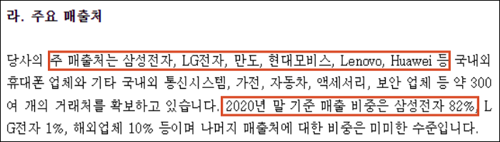 삼성전자, LG전자, 만도, 현대모비스, 화웨이 등 국내외 휴대폰 제조사 등이 있으며 2020년 말 기준 삼성전자의 매출 비중이 82%를 차지하고 있다.●해외기업 비중 10% 정도