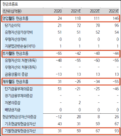 현금흐름표는 투자자라면 피염구 체크사항이다.투자활동 중인 설비투자 부문은 꾸준한 점, 2020년 일시적으로 차입금이 증가했지만 2021년부터 재무활동도 양호하다.현금자산의 증가 예상 현금은 언제든지 환영합니다.