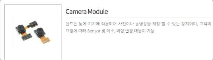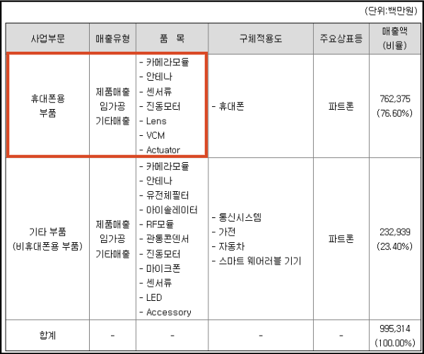 현재 휴대전화용 부품 쪽에서 75% 이상의 매출이 나오고 있다.카메라 모듈뿐만 아니라 안테나 사업은 안정적으로 영위하고 있으며 반도체 패키징 기술을 활용한 지문센서, 심박센서, 온도센서 등의 사업 영역까지 확장했다.