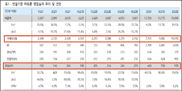 전장부문 카메라 파트의 성장이 기대되는 일각에서 예상할 때 전장부문 매출이 매년 2배씩 예상하고 있지만 사실 이 정도가 아니더라도 큰 실적 개선이 이뤄질 것으로 보인다.