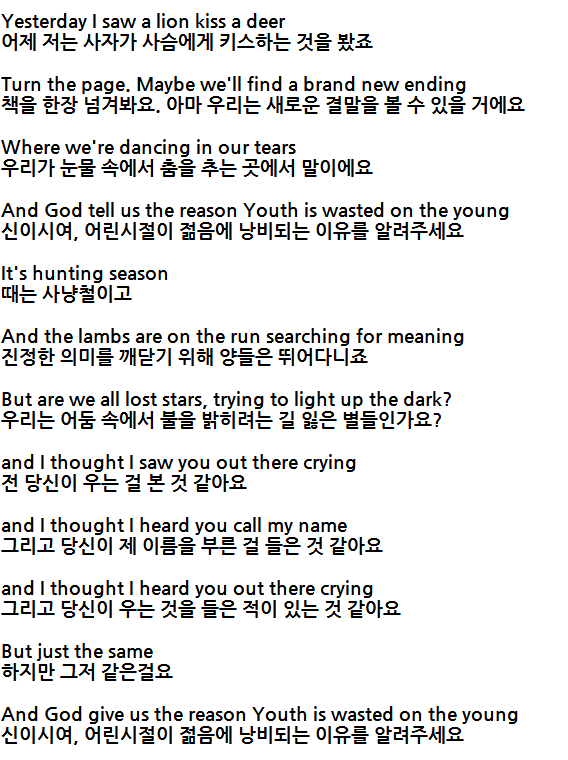 우리가 조심하지 않으면 현실로 변하고 우리의 최고의 추억이 당신에게 슬픔을 가져다주도록 허락하지 마라.어제 사자가 사슴에게 키스하는 것을 봤어.페이지를 넘기면 어쩌면 새로운 결말을 찾을 수 있을지도 모른다.