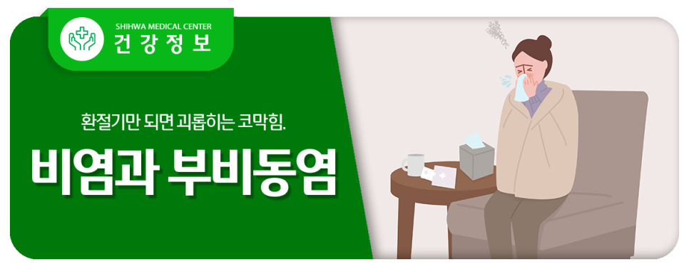 오늘은 시화병원과 함께 환절기에 급증하는 비염과 부비강염(축농증)에 대해 알아보겠습니다.특정 물질이 코 점막을 자극하여 발생하는 <알레르기성 비염>