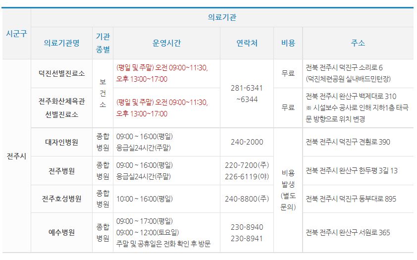 홈 > 코로나 19 > 선별진료소, 선별진료소, 현황 선별진료 의료기관, 질병관리청 콜센터 1339 전주시 보건소 063-281-6344 재난안전대책본부 063-281-2219 ☞ 보건소 운영 선별진료소에서는 거리를 두는 단계나 증상에 관계없이 누구나 진단받을 수 있습니다. 시군구 의료기관명 기관종별 운영시간 연락처 비용주소 전주시 덕진선별진료소 보건소(평일 및 주말) 오전 09:00~11:30, 오후 13:00~17:00 281-6341~6344 무료 전라북도 전주시 덕진구로… health.jeonju.go.kr 자세한 내용은 이곳을 참조.