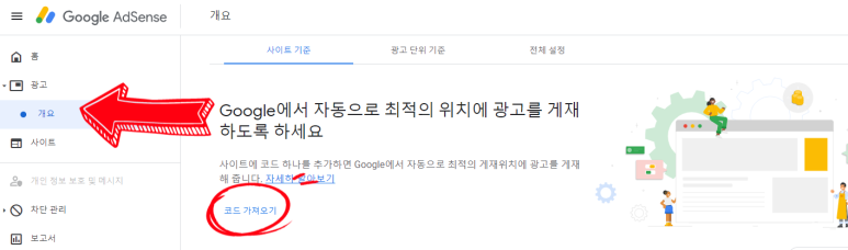 광고의 개요를 누르자. 그러면 아래의 코드를 가져오기라는 것이 보일 것이다. 이거 클릭~!