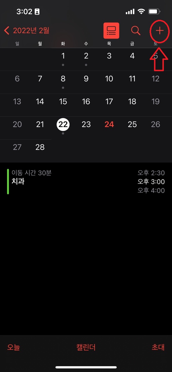 1. 일정추가 캘린더 앱에 들어가서 오른쪽 상단의 + 플러스 버튼을 눌러 일정을 추가합니다.