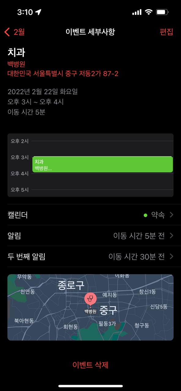 그런데 아이폰 달력 알림을 사용하고 나서 교통 앱을 미리 가동하지 않게 되었습니다.마치 제 비서가 혼자 생긴 느낌이랄까~! ?