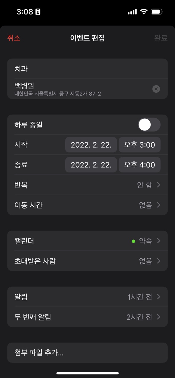 일정의 제목은 치과로 하고 진료 시작 시간과 종료 예정 시간을 입력합니다.