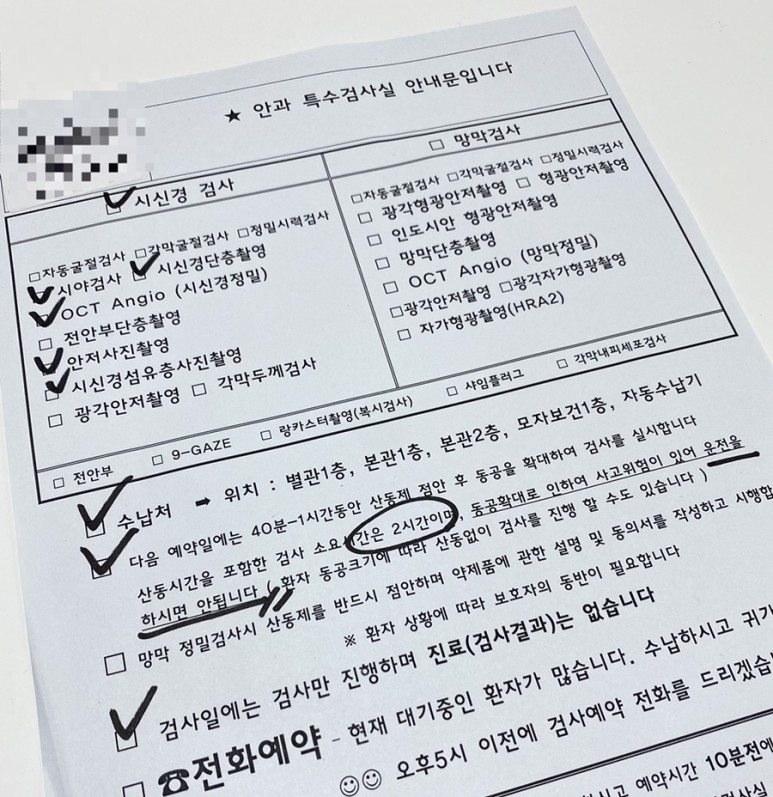 정기검사는 산동제(동공을 확장시키는 안약)를 넣는 시간이 조금 있기 때문이지 검사 자체는 그리 오래 걸리지 않는다. 동공 확장제를 넣고 동공을 확장시키면 운전은 할 수 없고, 근처의 휴대폰 글씨가 잘 보이지 않게 되고, 무엇보다 햇빛이 눈부신 날이면 검사가 끝나고 집에 갈 때 눈이 굉장히 많이 닿기 때문에 거의 절반의 눈을 감고 집에 가야 하기 때문에 선글라스를 가지고 돌아가도록 합시다.
