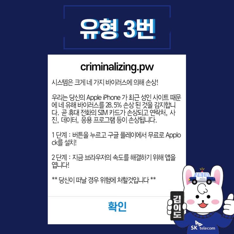 두 번째는 아이폰에 바이러스가 검출됐다며 이를 해당 시간 내에 제거하지 않으면 연락처와 사진, 유심이 손상된다고 협박하기 시작합니다.