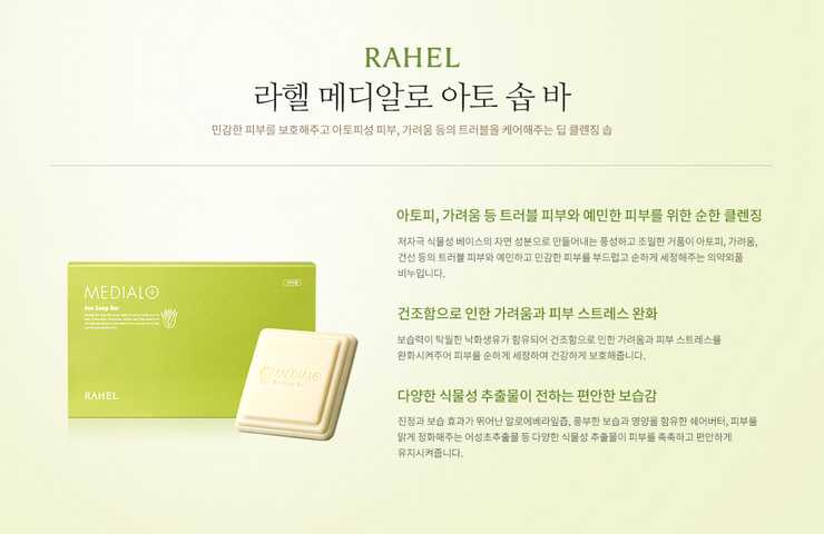 알로에마임화장품 태열,아토피,트러블피부,문제성피부가가려워서민감한피부로고통하시는분들의답변”라헬미디어로솝바”저자극식물성베이스의풍부하고밀한거품이아토피,가려움,건선등의트러블고민과민감한피부를부드럽고순하게세척해주는의약외품비누 라헬미디어로 아토솝버낙화생유가건조로인한가려움과피부스트레스를완화시켜주며 알로에베라잎즙과쉐어버터,촉촉하게식물성을유지시켜줍니다.오랜 사랑을 받아온 라헬메디알로젤 알로에, 카모마일, 백급, 유근피와 어성초 등 천연식물의 집중 공급을 통해 피부 진정과 함께 수분을 빠르게 공급하여 보습막을 형성하고 아르간오일, 시어버터 등 내추럴 성분이 피부 밸런스를 조절하여 피부를 건강하게 지켜주는 젤타입 보습제입니다.