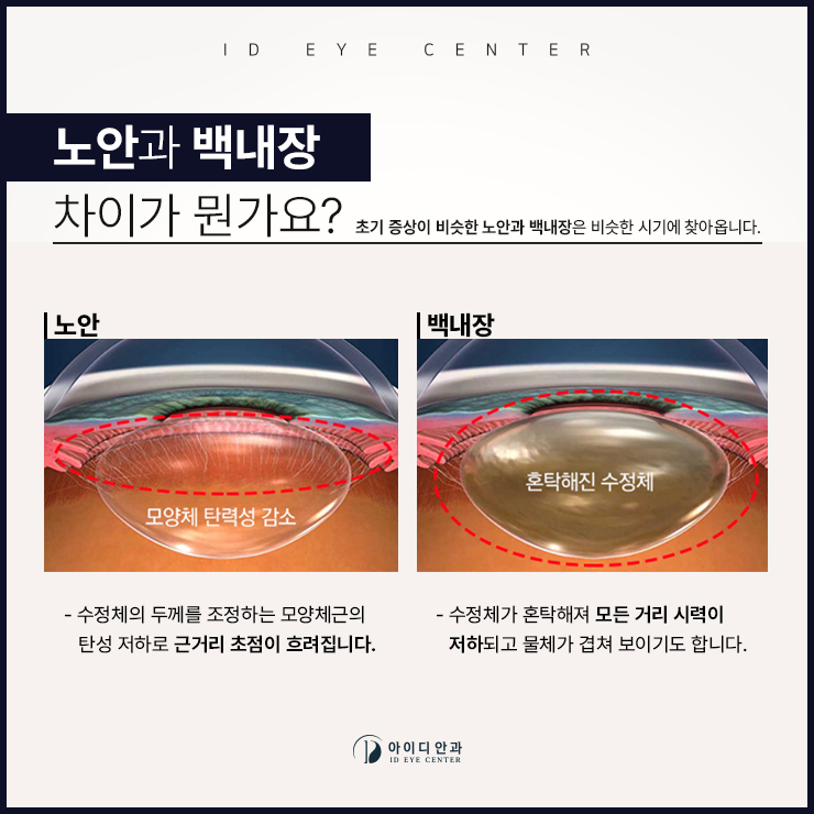 눈은 수정체가 망막에 빛을 모으고 상이 맺어지는 과정을 통해 더욱 선명하게 보이게 됩니다.그러나, 노화에 의한 변화, 외상으로 수정체에 이상이 생기는 경우, 고혈압이나 당뇨와 같은 대사 질환, 유전등의 원인에 의해서 수정체에 탁함이 생길 수 있습니다.이런 증상들이 강남노안백내장이에요.백내장은 노안과 발생시기가 비슷하기 때문에 만약 의심이 간다면 하루빨리 개선할 수 있는 방법을 찾아야 합니다.시력은 한번 나빠지면 회복할 수 있는 만큼 나이가 들면 당연히 생기는 증상이라고 생각하기보다는 초기에 바로잡는 것이 현명합니다.